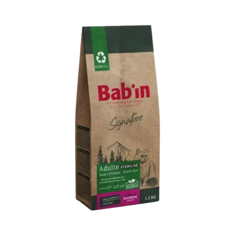 غذای خشک گربه بالغ عقیم شده salmon طعم ماهی برند بابین فرانسه، یک غذای بسیار قابل هضم است که به لطف وجود مجموعه ای از ترکیبات مانند مخمر آبجو، دانه های چیا و… پوستی سالم و براق را به گربه شما هدیه می دهد.
